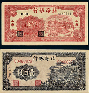 在抗戰(zhàn)勝利結束時,山東解放區(qū)已有極大發(fā)展,有12.5萬平方公里的面積,占山東總面積的92%,擁有2400萬人口,占山東總人口的90%。1948年10月,山東的北海銀行幣與華北的冀南銀行幣、晉察冀邊區(qū)幣固定比價互相流通,1948年11月16日起,北海銀行幣與華中銀行幣等價流通。這一時期的北海銀行幣均不加蓋地名,便于山東以外的地區(qū)流通。1948年12月1日,華北銀行、北海銀行、西北農(nóng)民銀行合并,在石家莊成立中國人民銀行,但因工作的需要,北海銀行繼續(xù)營業(yè),1949年1月底開始回收北海銀行幣,同年11月1日改稱中國人民銀行山東分行,至此,北海銀行完成了它的歷史使命宣告結束。